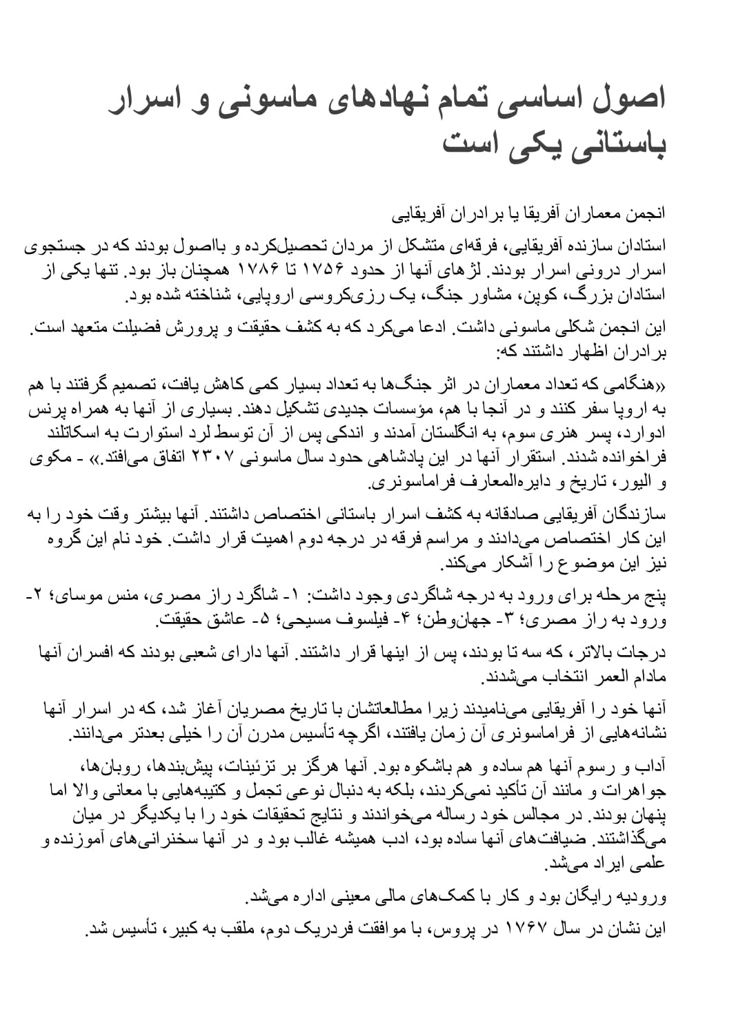 - وحدت اصول: درک این اصل بنیادین که اصول اساسی تمامی نهادهای ماسونی و اسرار باستانی یکی هستند.