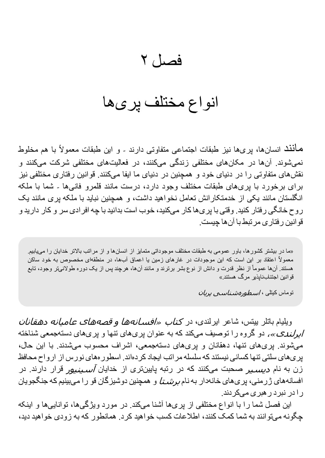 - تاریخچه واقعی پریان: ریشههای باستانی، ارتباط آنها با خدایان و الههها و نژادهای مختلف.