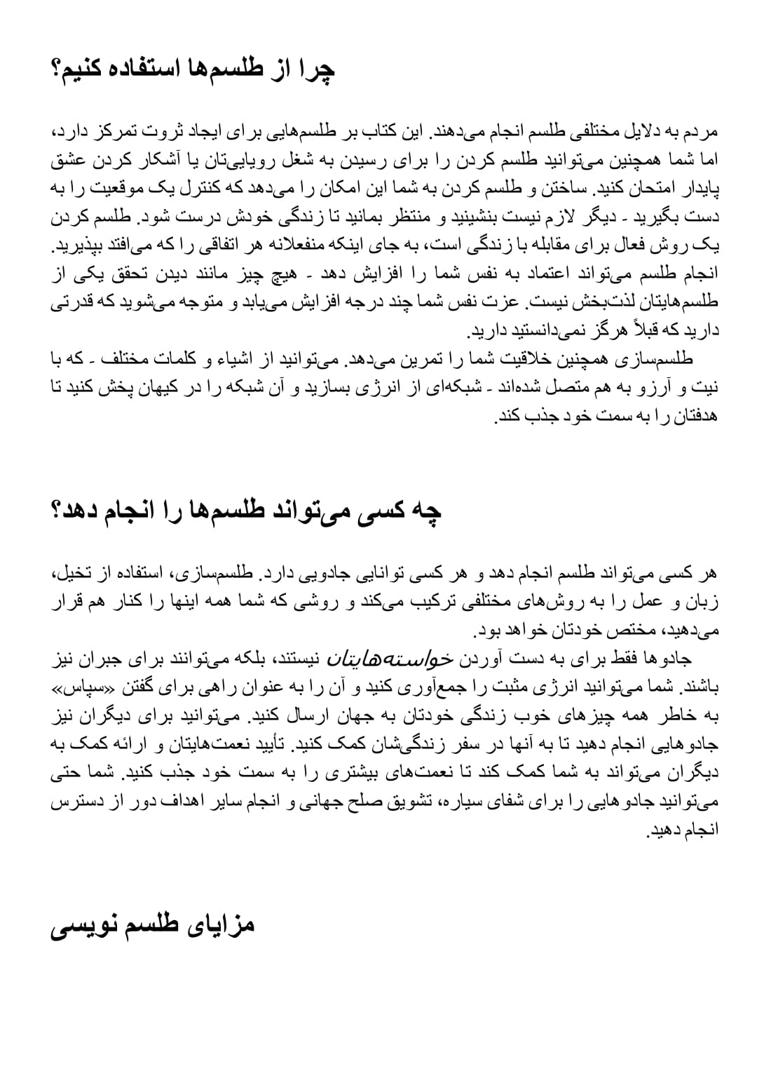 - ✨ تأیید ایمان: آموزش اهمیت ایمان به خود و توانایی کائنات در فراهم کردن نیازها به عنوان پیششرط کارکرد طلسمها.