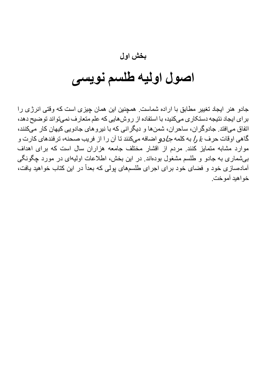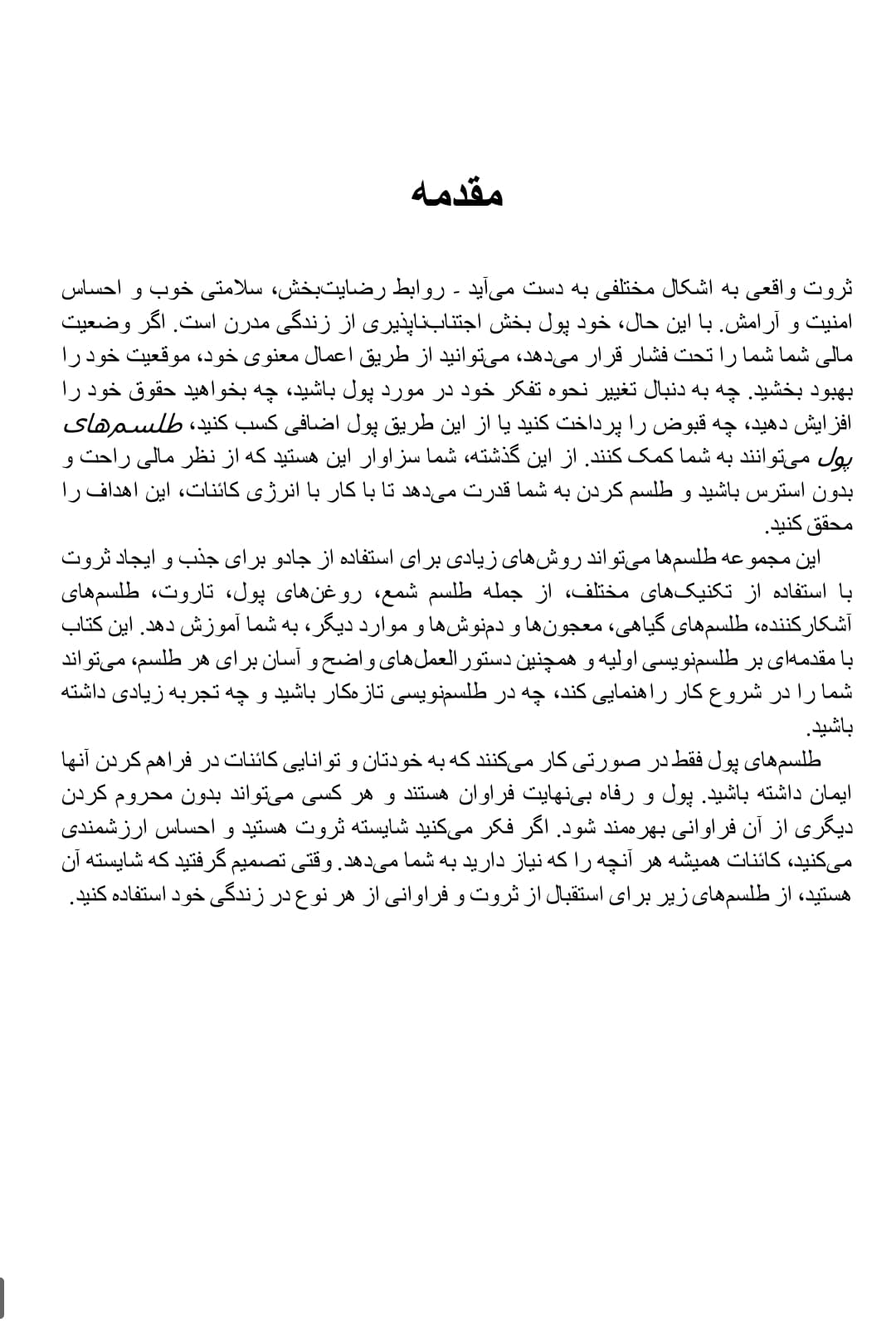 ایده مرکزی این کتاب، این است که پول و رفاه به صورت نامحدود فراوان هستند و بزرگترین مانع مالی، در واقع باورهای محدودکننده و طرز فکر ماست. طلسمها، ابزارهایی هستند که نیت و اراده شما را متمرکز کرده و آن را به انرژی کائنات ارسال میکنند تا فرآیند آشکارسازی را آغاز کنید. این کتاب با مقدمهای بر اصول اولیه طلسمنویسی آغاز میشود تا حتی مبتدیان نیز بتوانند به راحتی کار را شروع کنند: