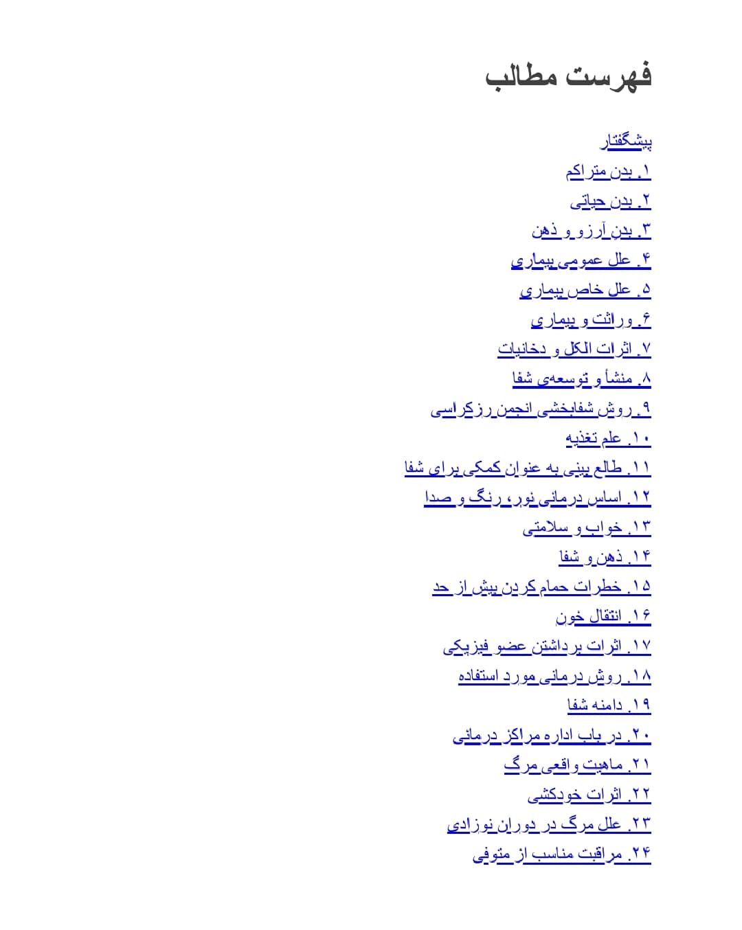 - ذهن و شفا: قدرتهای ذهن در تسریع و یا کند کردن روند بیماری و نحوهی استفاده آگاهانه از آن.