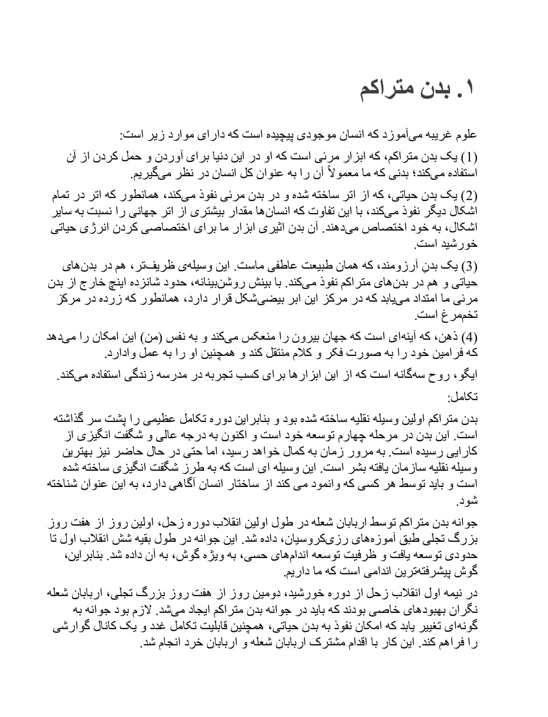یکی از ارزشمندترین بخشهای این جلد، تشریح دقیق ساختار پیچیده انسان است. هایندل با بیانی روشن، چهار جزء حیاتی وجود ما را معرفی میکند و اهمیت مراقبت صحیح از هر یک را توضیح میدهد: